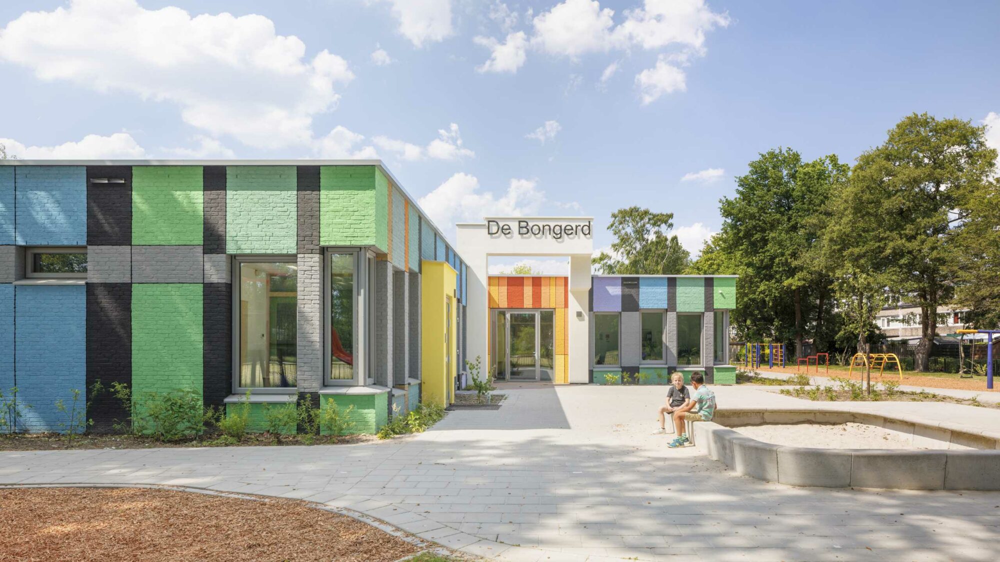 Een nieuw gebouw voor Openbare Basisschool De Bongerd in De Maten. Gelegen in een cluster met de eveneens nieuw gebouwde Katholieke Basisschool De Schakel en de vernieuwbouwde Christelijke Basisschool De Gong. Een plattegrond met de midden- en bovenbouwlokalen om een leerplein en de onderbouwlokalen en de kinderopvang om een eigen leer/speelplein. Het speellokaal, daar tussenin, kan bij het leerplein getrokken worden zodat een grote aula ontstaat. Ieder van de drie bouwen heeft een eigen entree met garderobe. En er is een formele hoofdingang bij de teamkamer en de directiekamer. Aan de buitenzijde is met financieel zeer beperkte middelen toch een gebouw met een krachtige uitstraling neergezet. Inspiratie voor de kleuren is dat het gebouw een slapende draak verbeeldt. Het schoolplein rondom de school is samengevoegd met dat van De Schakel en vormt buiten schooltijd een waardevolle speelplek voor buurtkinderen van basisschool-leeftijd.
