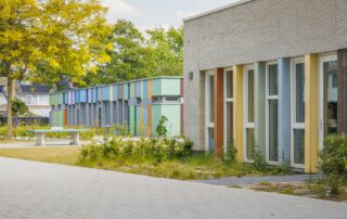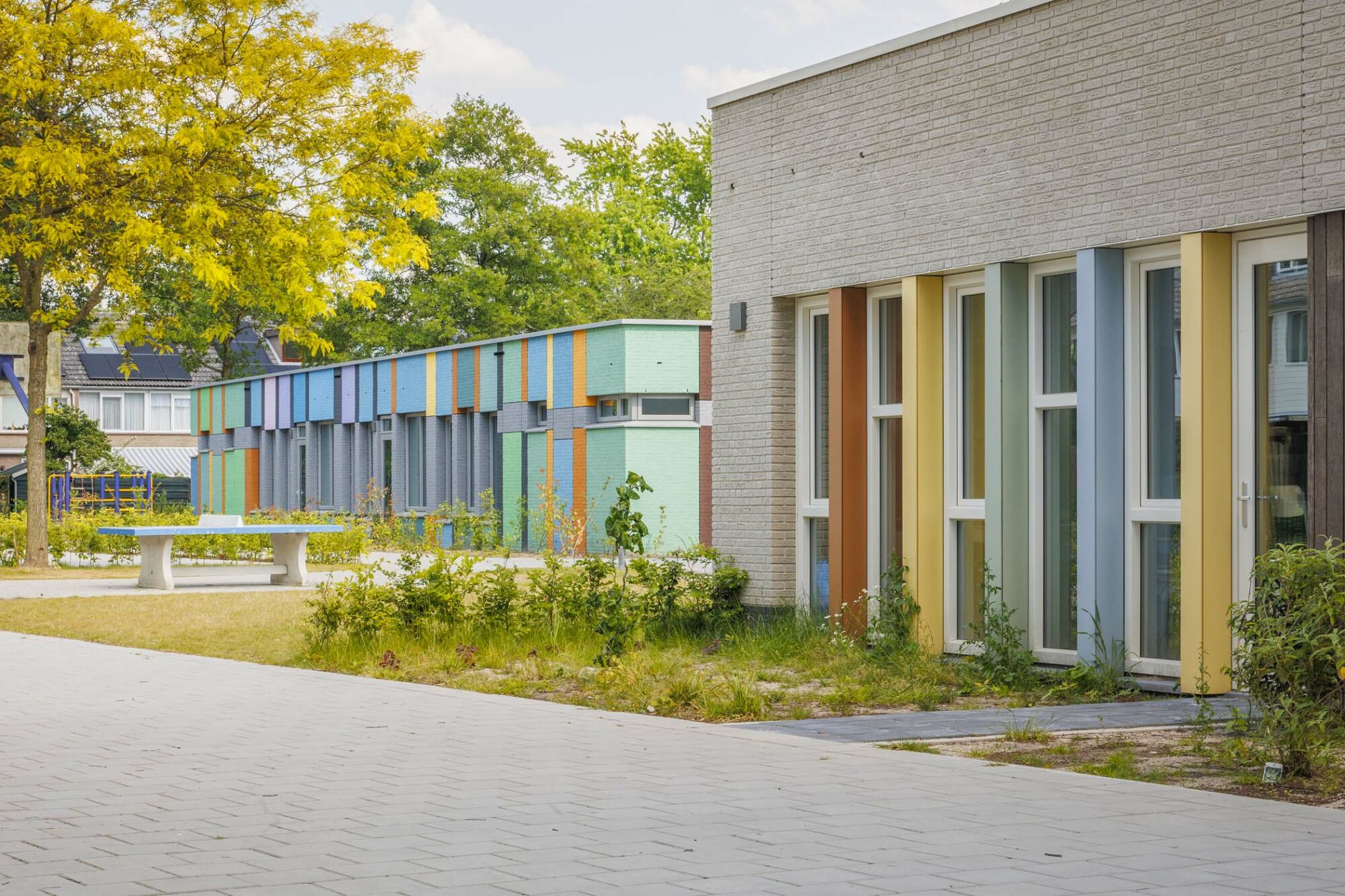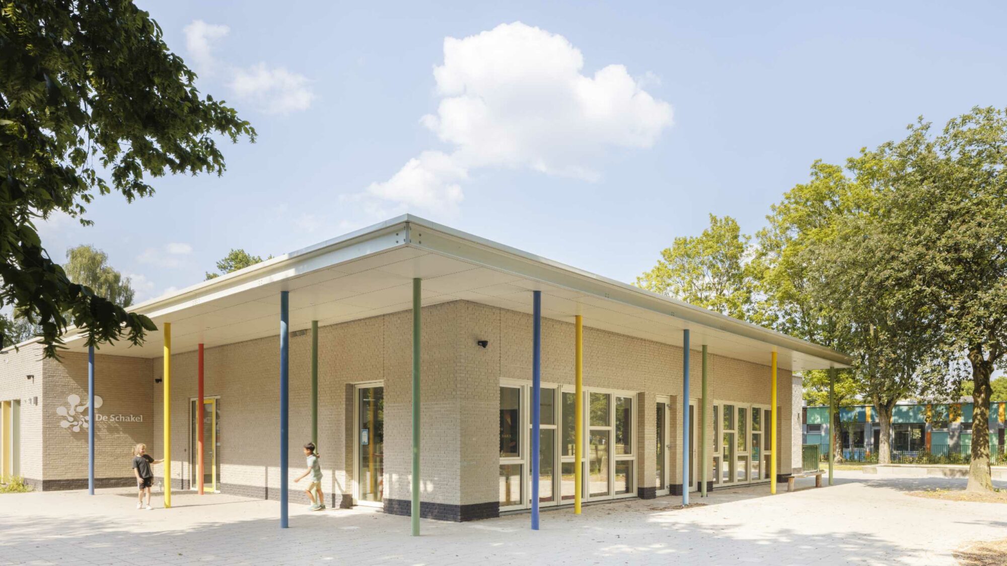 Een nieuw gebouw voor Rooms-Katholieke Basisschool De Schakel in De Maten. Gelegen in een cluster met de eveneens nieuw gebouwde Openbare Basisschool De Bongerd en de vernieuwbouwde Protestant Christelijke Basisschool IKC De Gong. Een plattegrond met de midden- en bovenbouwlokalen om een leerplein en de onderbouwlokalen en de kinderopvang om een eigen kleuterplein. Beide clusters komen door een eigen ingang naar binnen en de leerlngen vinden bij hun eigen bouw een nis met hun garderobe en toiletgroep. Door de teamkamer open uit te voeren met een flink keukenblok, kan deze ruimte tijdens lesuren ingezet worden als kook-atelier. Aan de buitenzijde is met financieel beperkte middelen een gebouw met een duidelijk eigen identiteit neergezet. Rust was een belangrijk uitgangspunt. Het overstek aan de zuidzijde bij de entree biedt een plek om bij regen toch droog te staan. De subtiel toegepaste kleuren geven een relatie met de naastgelegen school de Bongerd. Het schoolplein rondom de school is samengevoegd met dat van de Bongerd en vormt buiten schooltijd een waardevolle speelplek voor buurtkinderen van basisschool-leeftijd.